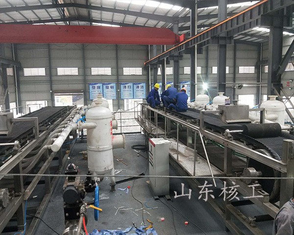 直到真空濾盤碰到接近開關(guān)裝置并切斷真空,此時(shí)真空濾盤在氣缸的拖動(dòng)下迅速返回到原始位置,濾帶在電機(jī)的拖動(dòng)下繼續(xù)運(yùn)行,這樣周而復(fù)始進(jìn)行真空抽池、洗滌、再抽濾,濾餅在卸料輥處被刮刀裝置刮離卸除,濾布經(jīng)清洗后獲得再生,再經(jīng)過(guò)一組支承輥和糾偏裝置里新進(jìn)入過(guò)濾區(qū)。濾液在集液罐中隨著濾盤返回時(shí)排出。