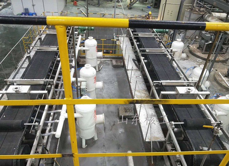 連續(xù)水平帶式真空過(guò)濾機(jī)是一種自動(dòng)化程度高的新型過(guò)濾設(shè)備,該過(guò)濾機(jī)以過(guò)濾布及濾網(wǎng)為介質(zhì),使料漿水平布置于過(guò)濾介質(zhì)之上,充分利用料漿重力和真空負(fù)壓吸力實(shí)現(xiàn)固液分離。連續(xù)水平真空帶式過(guò)濾機(jī)可適用于多種濃度條件下的物料。它能連續(xù)自動(dòng)完成過(guò)濾、濾餅洗滌、卸渣、濾布再生等工藝操作,并且母液有與濾餅洗滌液可以分段收集。具有過(guò)濾效率高、生產(chǎn)能力大、洗滌效率好,濾餅水分低、操作靈活、維護(hù)簡(jiǎn)單等優(yōu)點(diǎn),因而被諸多工業(yè)部門優(yōu)先采用。